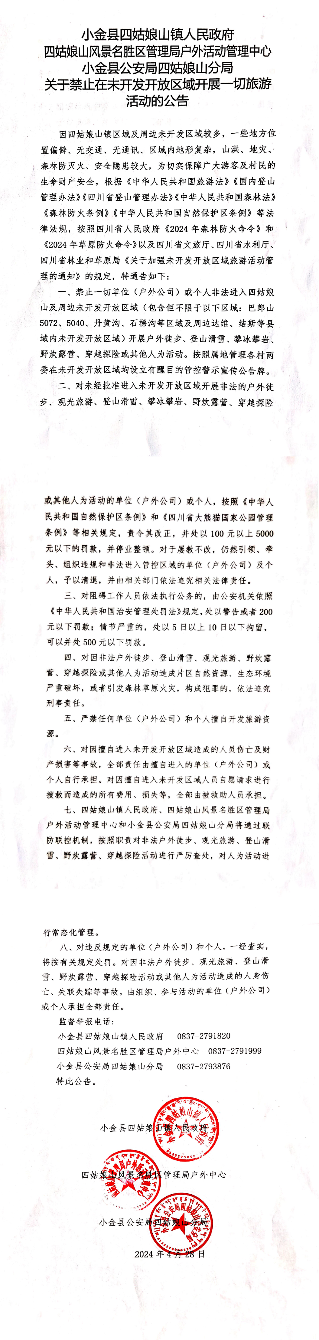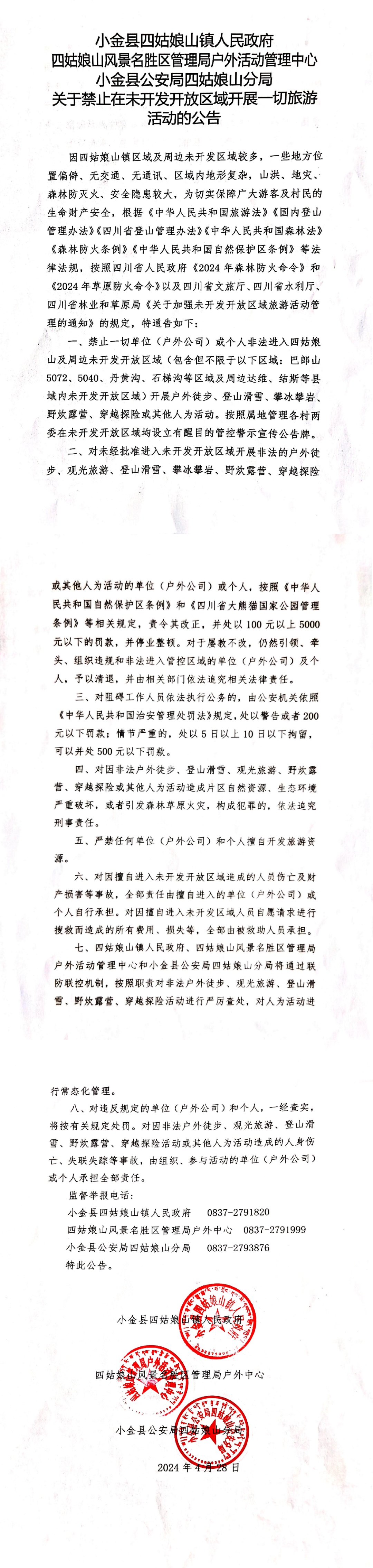 公告指出,因四小姐山镇区域及操纵未确立区域较多,一些田看法置偏僻、无交通、无通信、区域内地形复杂,山洪、地灾、丛林防熄灭、安全隐患较大,为切实保险繁多搭客及村民的人命财产安全,辞谢一切单元(户外公司)或个东谈主违纪参加四小姐山及操纵未确立灵通区域(包含但不限于以下区域:巴朗山5072、5040;丹黄沟、石梯沟等区域及操纵达维、结斯等县域内未确立灵通区域)开展户外徒步、登山滑雪、攀冰攀岩、野炊露营、穿越探险或其他东谈主为手脚。